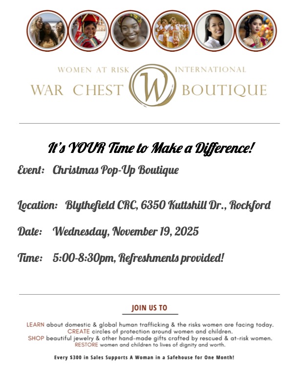 Come shop for Christmas while supporting women rescued from trafficking!  Refreshments served!  Items include care products, scarves, candles, bags, ornaments, and kids items.  Invite your family and friends!